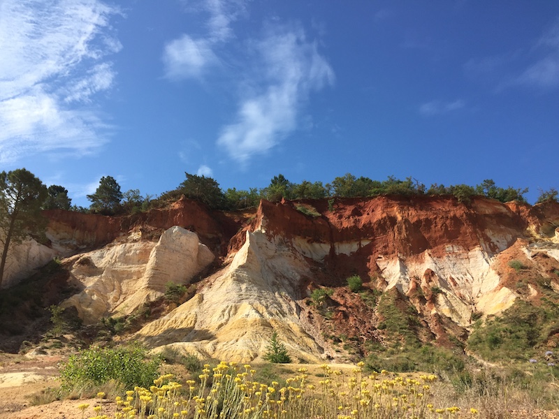 Der Tag sollte wieder sehr heiß werden, also brachen wir früh über die D22 auf, um noch vormittags den Sentier des Ocres (Ockerweg) bei Rustrel zu machen. Für 5 € konnten wir im Schatten unter Bäumen parken. Wir wanderten fast ganz alleine die lange Wegstrecke, die uns mit vielen phantastischen Farben und Formen begeisterte. Auf dem Rückweg war es nach Mittag und sehr heiß geworden. Jetzt strömten doch einige Besucher auf die Strecke, puh ...