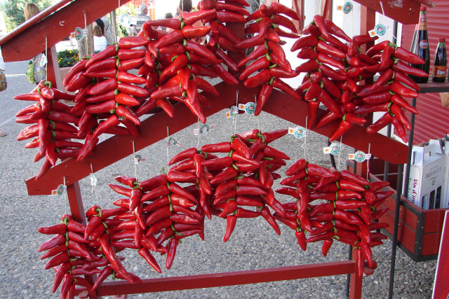 Vormittags fuhren wir gemütlich über die D932 ins nahe gelegene Espelette, dem Zentrum des Paprikaanbaus. Man glaubt gar nicht, wo man überall Paprika als Beigabe zufügen kann. Nach einer ausgiebigen Besichtigung von Espelette suchten wir uns einen Terassenplatz in einem guten Restaurant, um einmal original baskisch zu essen. Was wir dann serviert bekamen war hervorragend, einfach "ein Gedicht".
